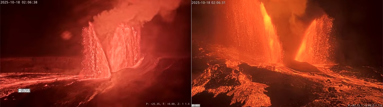 Kilauea - Capture d’écran simultanée des webcams USGS, V1 à gauche et V3 à droite, des secteurs ouest et sud de l’Halema’uma'u du Kīlauea,