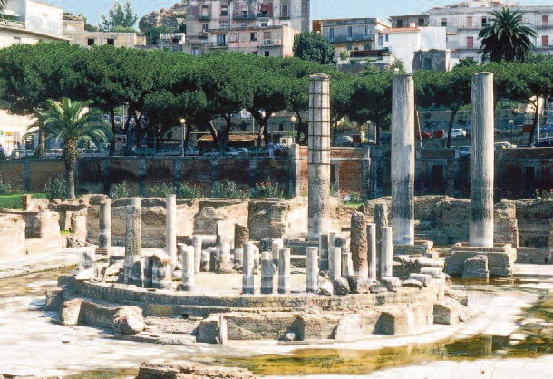 2. Le Serapeum de Pouzzoles exondé par les bradyséismes de 1969 - 1985 (les mollusques marins ont laissé les traces noires sur les trois colonnes)